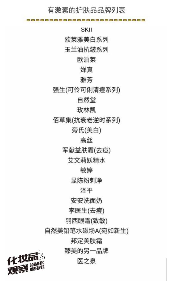该文中的名单与上述名单大同小异,但上述名单第一个中枪的品牌“SKII”(正确写法应为SK-II)并不在其中,且“玉兰油抗皱系列”直接变成了玉兰油,“美国的倩碧”变成了“产自法国的倩碧”……两个名单在细节上有较大出入。