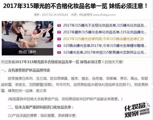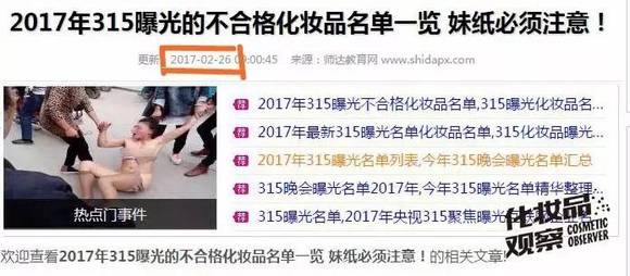 然后品观君去百度搜了一下这个名单,发现有一个叫“师达教育网”的网站也发布了“2017年315曝光的不合格化妆品名单一览 妹纸必须注意!”这样一篇文章。