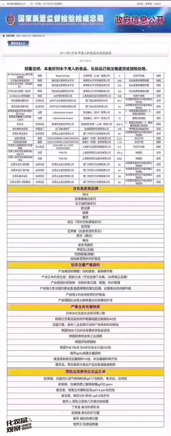 品观君搔了搔头,这个列表写得还真是不负责任。国家公布某个化妆品品牌有质量问题的时候,一定会明确到具体的单品和批次,像这种把一个品牌的系列乃至整个品牌都说成是国家禁用的,其合理性显然有待验证。
