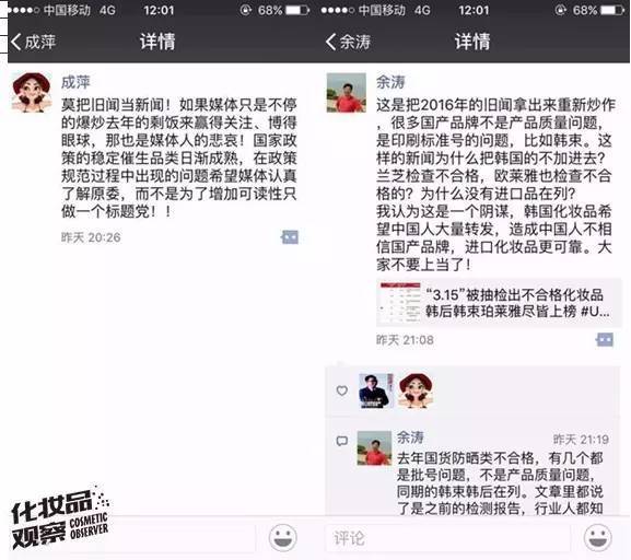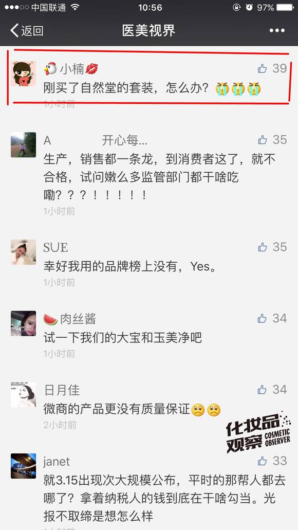 该文章在今日上午已被删除,但这类谣言信息的传播,甚至能直接影响到人们的消费决策。一位读者在文末留言称“刚买了自然堂的套装,怎么办?#哭脸#哭脸#哭脸”。站在名单中化妆品品牌的角度来看,或许这个“名单”每年传播一次,就会使其失去一些忠实粉丝。简直可耻!