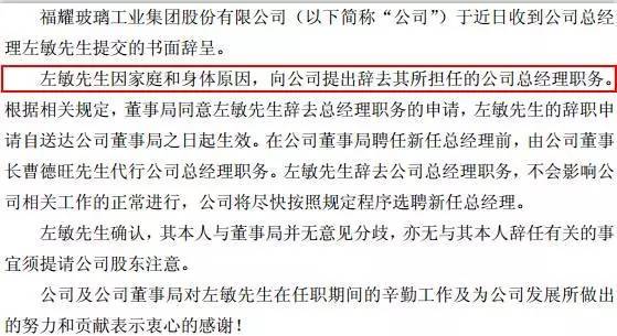福耀玻璃的公告称,左敏此番离职是因为“家庭和身体原因”。邮报君获悉,左敏的妻子和孩子定居国外,因此他与家人常年两地分居。邮报君认为,虽然家庭原因至关重要,但那不是全部原因。