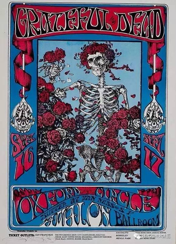 相较而言,设计师组合Mouse和Kelley在嬉皮士设计中的风格更为独特,吸收了英国传统插画的技巧。其为迷幻摇滚乐队Grateful Dead制作的海报成为经典中的经典,玫瑰与骷髅的搭配后来成为Grateful Dead的标志。