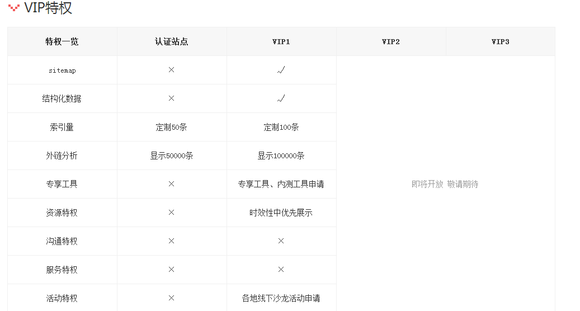 据百度站长平台公告,要进入这个VIP俱乐部,是需要有“邀请码”的。而进入VIP之后享受的特权如图所示,从认证站点到VIP1,再到未开放的VIP2、VIP3,可谓层级分明,权益也是随层级倍增倍差的。各位,看出这里面的门道了吗?