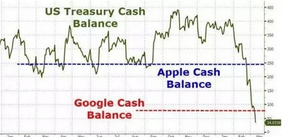 据金融博客Zerohedge统计:在今年1月初,美国政府的现金余额为大概4000亿美元;特朗普就任当天,美国政府的现金余额为3840亿美元;而如今,即特朗普上任2个月左右时,美国政府的现金余额只剩340亿美元。