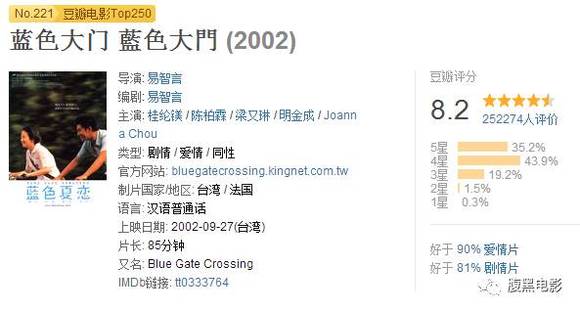 这部出自台湾的青春片,豆瓣得分8.2,好于90%的爱情片,好于81%的剧情片,稳居豆瓣套普榜的221位。