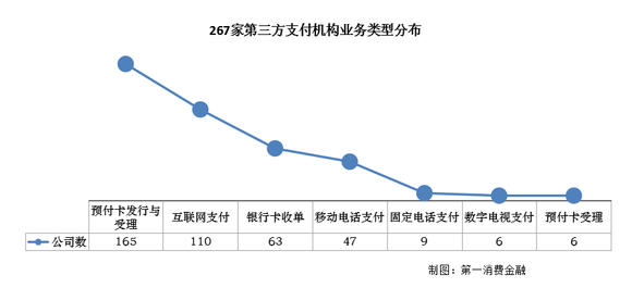 第一消费金融根据央行数据统计,267家第三方支付机构获得的支付牌照有着不同的业务类型,合计共406种。其中有165家获得预付卡发行与受理资质,110家获得互联网支付资质,63家获得银行卡收单资质,47家获得移动电话资质。前述四种累计业务资质占据总数的比例约为95%。