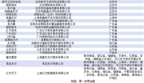 不同的业务类型,对应着不同的业务开展地域范围。互联网支付、固定电话支付、移动电话支付的业务范围为全国。数字电视支付牌照业务开展范围为省级和国家两种。预付卡(预付卡发行、预付卡发行与受理、预付卡受理)经营范围从地级市到全国不等。银行卡收单业务开展范围有省级和全国两种。此前上海点佰趣信息科技有限公司有指纹支付业务,现在央行官网显示其业务范围仅有银行卡收单。