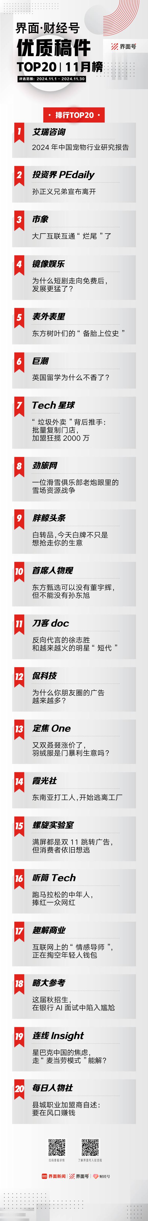 行走烟火人间,穿越四季光阴,界面·财经号1000多位成员立足于现实生活,持续观察千姿百态的商业现象,破解商业世界背后的秘密,在2024年11月1日至11月30日期间累计发文近2000篇。其中,以下20篇稿件脱颖而出,荣登《界面.财经号优质稿件TOP20|11月榜》,用原创彰显独立思考的力量。
