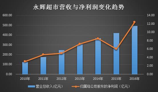永辉超市(601933.SH)日前发布2016年年报,公司去年营业总收入492.32亿元,同比增长16.82%;净利润12.42亿元,同比增长105.18%。