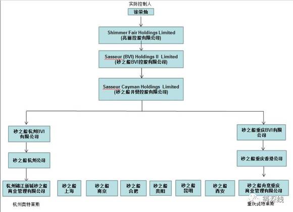 2016年4月,杭州砂之船商业管理股份有限公司(下称:杭州砂之船)挂牌新三板,被称为“中国奥莱第一股”。《杭州砂之船商业管理股份有限公司公开转让说明书》(2015年12月)里,公布了砂之船境内外公司架构图,以6~7层子公司的形式,控股其在全国的诸多奥特莱斯,《等深线》部分简化如下: