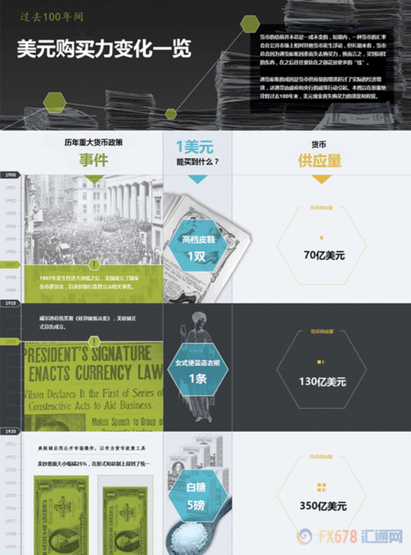 100年的时间,会改变很多东西,这个世界的面貌,当然还有你我手中的货币。100年前的1美元可以购买一双高档皮鞋,而现在只能下载1首歌曲。货币购买力的下降折射出货币供应量的巨幅膨胀,如今流通中的美元总面额是20世纪初的1900倍!
