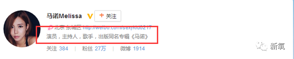 现在的微博认证是演员、主持人、歌手。有860线的品牌找她做广告,980线的电视剧找她演戏。