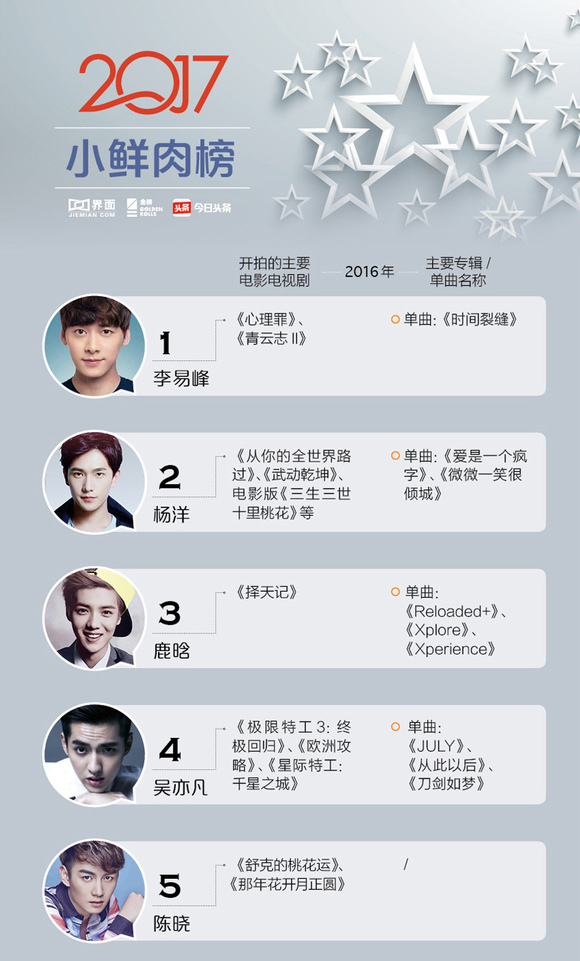 在2017小鲜肉移动互联网热度榜上,李易峰、杨洋、鹿晗、吴亦凡、陈晓位列前五甲。