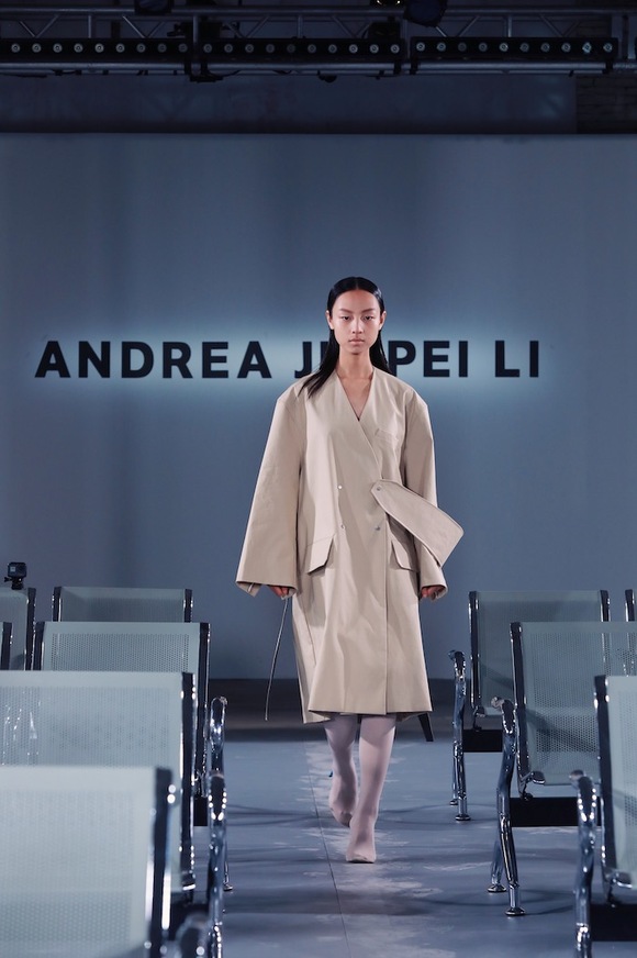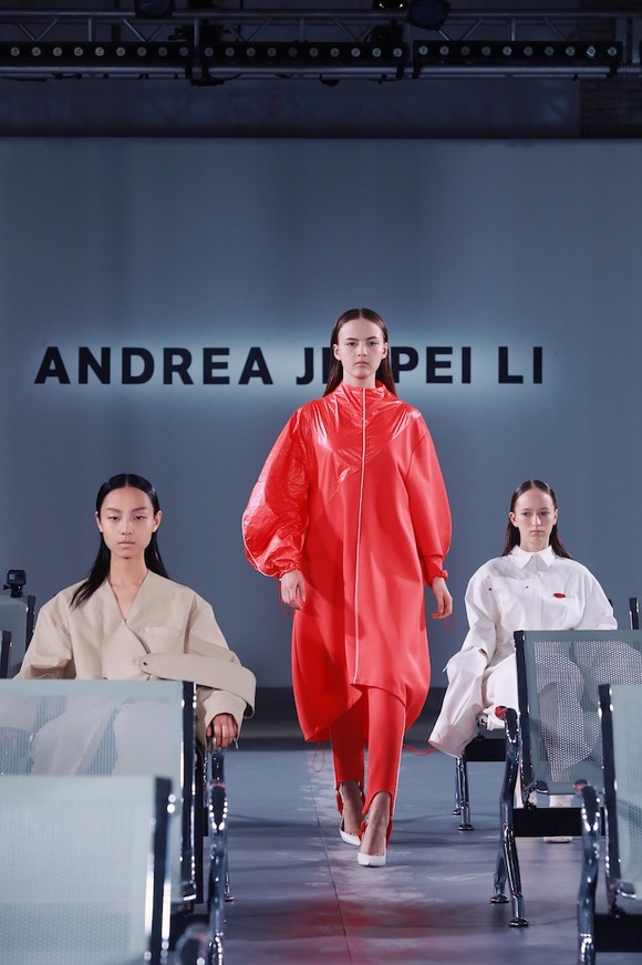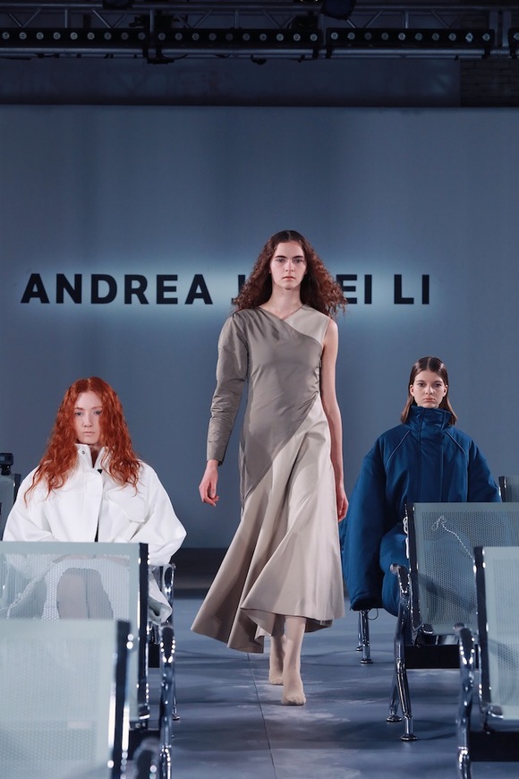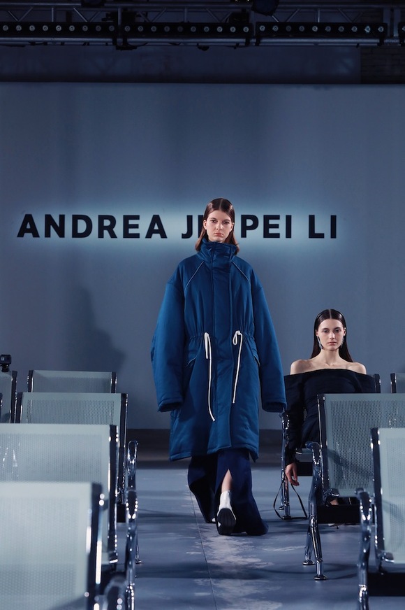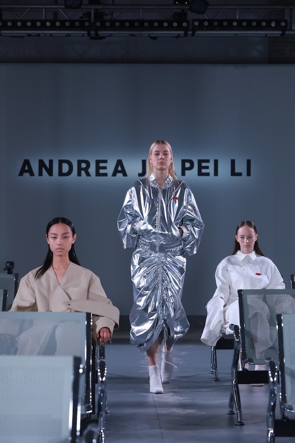 秀场被布置成了候机大厅,模特配合“登机广播”依次走出,再一一落座。设计师李佳佩的同名品牌Andrea Jiaper Li 2017秋冬系列正式发布。这一季李佳佩从电影《降临》中获得灵感,以她擅长的大廓型以及创新面料展现出了未来感。但她本人在秀后采访中表示,她希望整个系列“又不是那么未来的,只要女生穿上她能表现出自信就好”。因此,整个系列中对科技型面料的使用,多是出于点缀或是混搭的目的,此外,新作的廓形也相较以往几季收敛了一些,进而让实穿性更高。
