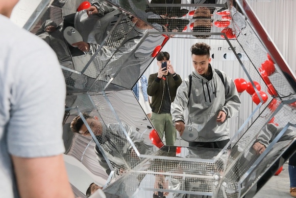 这一季,Particle Fever以“I Am A Masterpiece”为题举行了一场围绕打底裤和冲锋衣举办的艺术展。品牌核心的产品以艺术表现的形式在墙边一一陈列,参观者可以通过触摸的方式感觉到面料的机能感。而在这些“展品”前,品牌借由万花筒乒乓球等装置强调品牌不无聊运动的主题。