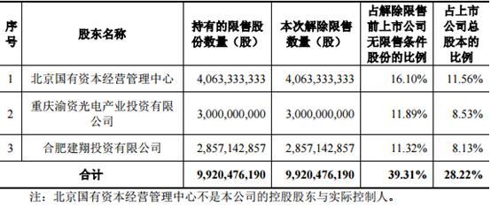 本次京东方A解禁涉及的股东有3家,分别是北京国有资本经营管理中心、重庆渝资光电产业投资有限公司和合肥建翔投资有限公司,三者解禁市值分别有149亿元、110亿元和104亿元。