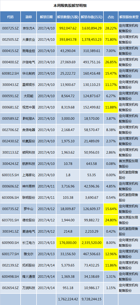 本周解禁数量超过1亿股的上市公司有9家,分别为京东方A、大康农业、长江电力、渤海金控(000415.SZ)、雅戈尔(600177.SH)、许继电气(000400.SZ)、华北制药(600812.SH)、罗牛山(000735.SZ)和星辉娱乐(300043.SZ)。