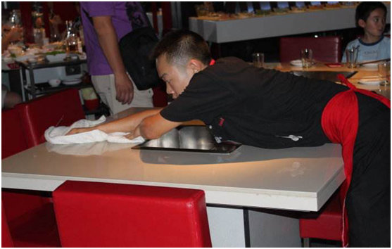 网上有很多海底捞服务员擦桌子的视频,快到夸张的动作,让网友们咂舌。