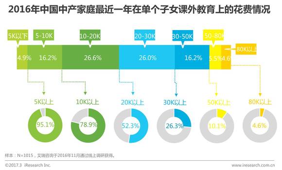 在过去一年里,78.9%中产阶级家庭在子女课外教育上的年消费在10000元以上;超过半数的家庭在课外教育上的年消费在20000元以上,占比52.3% ;26.6%的家庭在课外教育上的年消费在30000元以上。