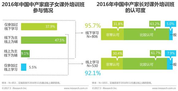 中国中产阶级是一个十分重视子女的教育、并且愿意在子女教育上投入更多的群体。接受艾瑞调查的家长以70后和80后居多,他们在工作中多任职中层管理和专业人士,可以说是正在职场中拼搏的社会中坚力量。他们大多工作很忙,但也会挤出时间为下一代的教育而付出,他们对子女高要求高投入高期待,对子女的教育现状也有困惑有顾虑,但同时对未来有计划有愿景。他们希望子女能得到更个性化的教育,得到更有针对性的学习指导,而就目前来说,为子女选择有教学效果的课外培训,是他们更认同的“个性化教育”方式。