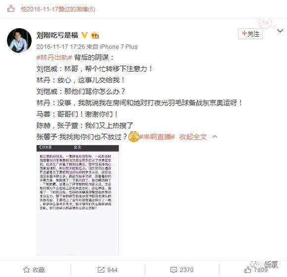 点赞调侃林丹、刘恺威、陈赫的微博。