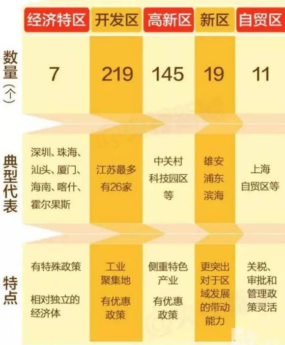 开发区是全球化时代我国由计划经济转变为市场经济背景下,为突破体制束缚,寻找发展新引擎,在城市中出现的一种新经济和社会空间。截止今天,我国一共有11个自贸区、19个国家级新区、7个经济特区、145个国家高新技术开发区和219个国家级经济技术开发区。