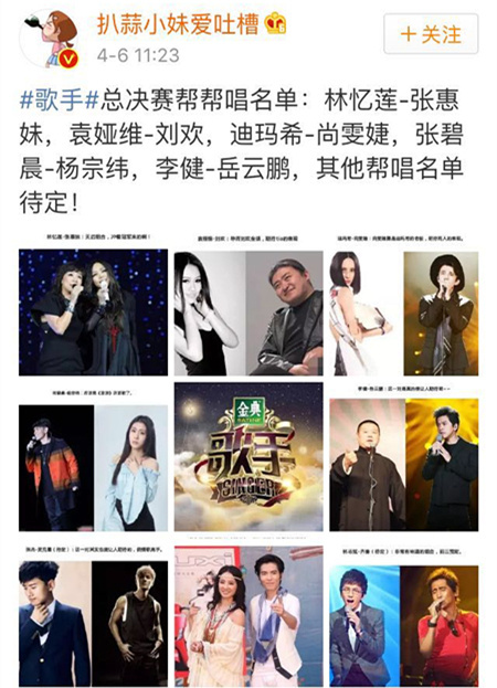 根据网友爆料,届时,林忆莲请来的帮唱嘉宾是张惠妹,两位实力天后将同台献唱;张碧晨的帮唱嘉宾是杨宗纬,两人或许会同唱那首期待值很高的《凉凉》;而袁娅维更是邀请了刘欢作为自己的帮唱嘉宾。