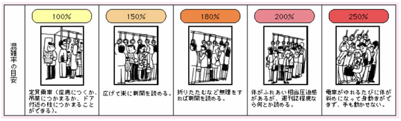 日本铁路行业协会在衡量列车乘客立席密度的时候,有一个重要参数是人们手中的报纸。在满载率100%的情况下,人们能抓住车厢内的吊环;在满载率150%的情况下,人们与其他乘客并肩而立,但还有空间可以翻阅报纸;在满载率180%的情况下,人们必须把报纸折了又折,才能勉强浏览。当满载率超过200%,读报变得毫无可能,人们无法动弹,手也很难活动,唯一能做的,就是与他人一同随着列车的晃动而摇摆倾斜。