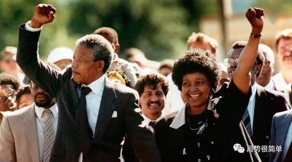 (1990年曼德拉重获自由,与妻子温妮向媒体挥手)