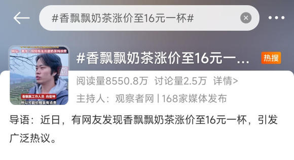 针对涨价热议,香飘飘在微博发文回应,品牌目前有且仅有明前特级龙井轻乳茶一款产品定价16元一杯,其他产品并未涨价。