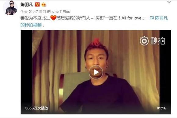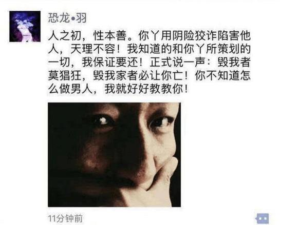 4月15日凌晨,陈羽凡在朋友圈发文写道:“我知道的和你X所策划的一切,我保证要还。毁我家者必让你亡!你不知道怎么做男人,我就好好教教你!”