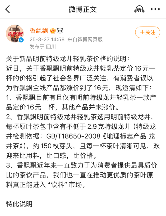 随后,香飘飘紧急对该事件做了回应。其表示,并不是所有的产品都涨价了,而是仅有明前特级龙井轻乳茶一款产品定价16元一杯。同时,香飘飘也介绍了产品的用料,解释了定价的合理性。