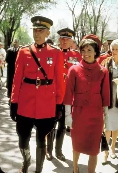 1961年出访加拿大前,杰奎琳和自己的御用设计师为着装讨论了很久。最终穿上的红色套装,风格鲜明的高圆领、七分袖、直身裙和小圆帽,那抹红色正是是加拿大皇家侍卫军制服的红色,整个形象华贵尊严,充满了力量。这次出访大获成功,当她和加拿大皇家侍卫军一起缓缓走过的时候,人们情绪沸腾激昂了。