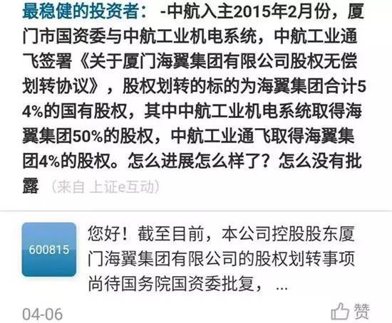相关的协议签署2年多之后,海翼集团的股份迟迟未进行划转。期间,不断有投资者通过互动平台向厦工股份询问进展。创事纪邮报(themakerpost)注意到,最近一次的提问发生就在2017年4月6日。