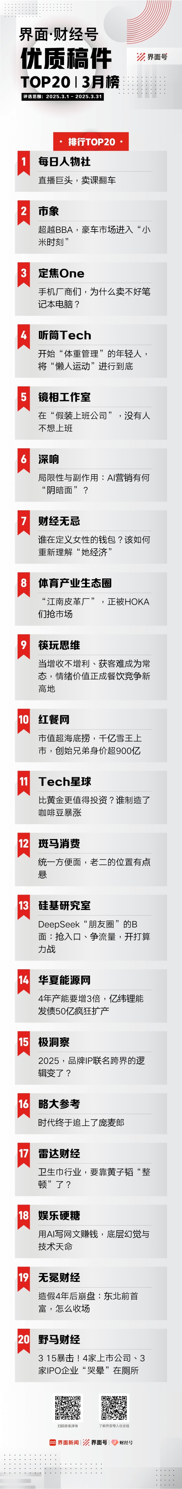 行走烟火人间,穿越四季光阴,界面·财经号1000多位成员立足于现实生活,持续观察千姿百态的商业现象,破解商业世界背后的秘密,在2025年3月1日至3月31日期间累计发文近2000篇。其中,以下20篇稿件脱颖而出,荣登《界面.财经号优质稿件TOP20|2025年3月榜》,用原创彰显独立思考的力量。