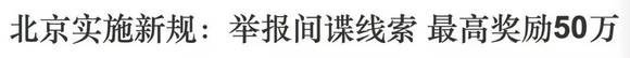 北京市国家安全局根据《中华人民共和国反间谍法》推出的《公民举报间谍行为线索奖励方法》正式实施。根据奖励办法,对侦破间谍案件起到重要作用的,最多可获奖励50万元。