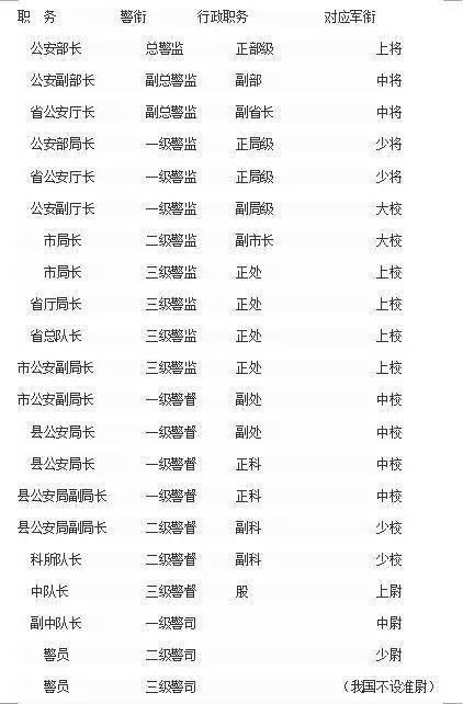 说完之后,相信大多数的看官老爷们都有点蒙圈了吧。没关系,我们列出来了一张对应表,可以让看官老爷们一目了然的了解到警衔,军衔,行政官职的对应职务。
