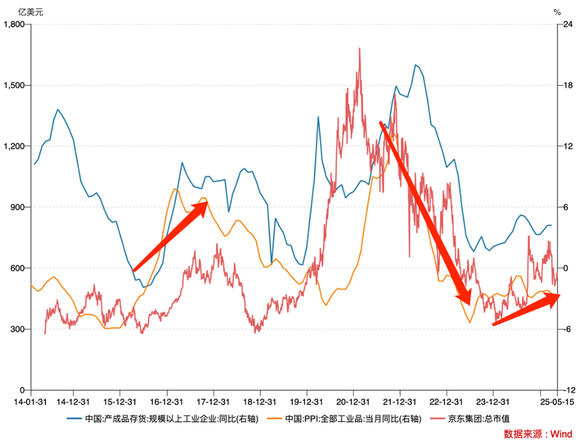京东以自营业务起家,商业模式以‘赚差价’为核心。凭借物流时效性优势,其长期被视为消费升级标杆企业。这一逻辑可从行业的顺周期中得到验证:在景气上行阶段,企业主动加库存推高社会价格中枢(需求增长),京东通过‘利差’红利放大收益,进而获得资本市场青睐。