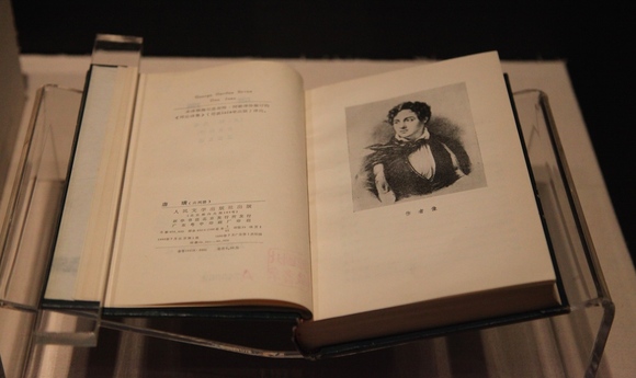 本次展览中的第一件展品就是著名浪漫主义诗人拜伦于1818年开始创作的讽刺长诗《唐璜》的手稿。为了展示《唐璜》在中国的翻译、传播和接受情况,国图也选出了八件珍贵馆藏配合拜伦的手稿,其中包括三本国图收藏的两本英文版和一个法文版拜伦诗集,1926年中华书局出版的梁启超的《新中国未来记》,1948年版《鲁迅全集》中的《坟》,1946年新知书店出版的陈秋子翻译的《拜伦传》,1956年朱维基版和1980年查良铮版的《唐璜》译本。