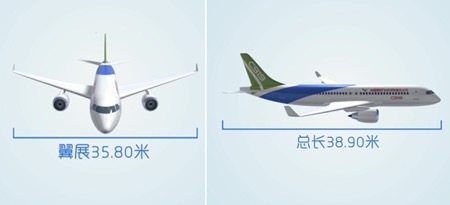C919客机总长38.90米,高11.95米,翼展35.80米,巡航速度0.785马赫,最大飞行高度12,100米。标准航程4075公里,最大航程能都达到5555公里,相当于北京直飞新加坡的距离。