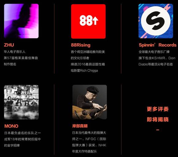 率先公布的5组国际评委——华裔电子音乐人zhu、亚洲嘻哈文化输出平台88rising、全球电子大厂spinnin、日本指弹大师岸部真名、后摇金字招牌MONO,也能看出此次寻光计划追求“更国际”的信心。如果再仔细看看评委的Title,不难发现此次虾米把寻找的方向更多地锁定在了当前越来越火的电子和嘻哈上。