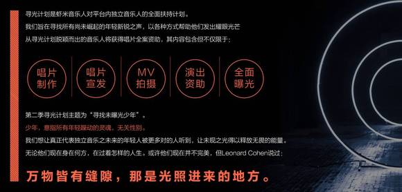 在3年后的今天,在网易云音乐、太合音乐以及echo回声等等在去年相继推出“石头计划”、“T制造”和“echo未来音乐人·百人签约计划”后,虾米的第二季“寻光计划”似乎有些姗姗来迟。