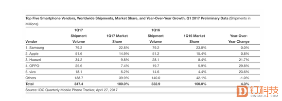 二是品牌集中度在提高。随着全球市场的萎缩,市场拓展愈发困难,这对一些中小品牌造成了更大的挑战。而品牌、渠道、技术能力更突出的品牌,在竞争中优势会更明显,市场份额也由此进一步向头部品牌集中。IDC报告显示,第一季度前五大品牌的市场份额总和为60.2%,高于去年同期的57.3%。