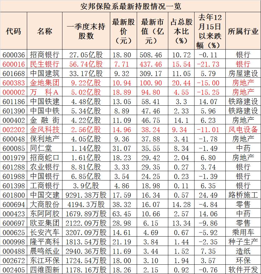 根据中国基金报记者统计,截止今年一季度末,安邦保险系(含安邦保险集团、安邦人寿、安邦财险、安邦资产等)出现在24只股票的前十大流通股东中,按最新股价计算,持股市值1883.53亿元。并且与去年底相比,持股几乎没有发生变化。