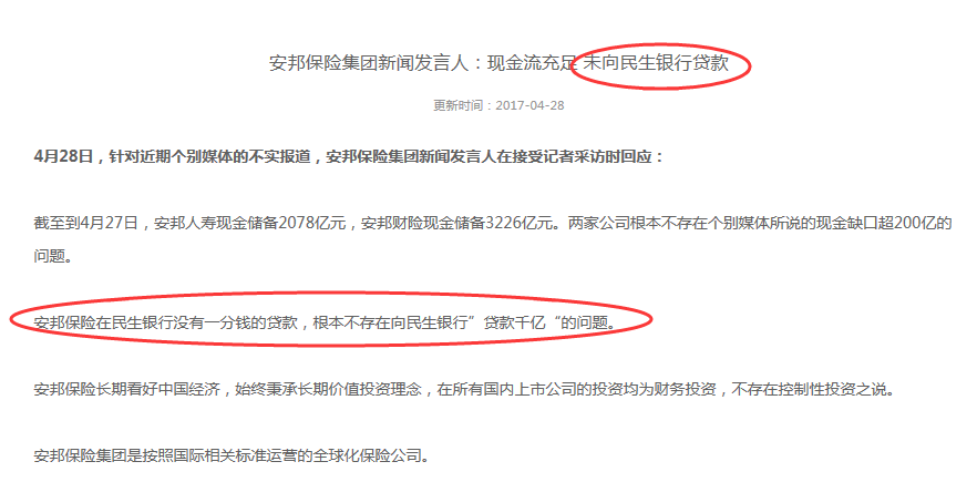 并且在4月28日,安邦保险在官网发布了市场上对其与民生银行业务关系的回应。该回应称,现金流充足,未向民生银行贷款。