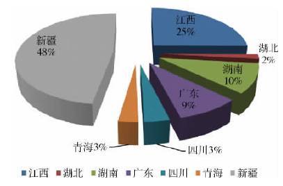 我国铷资源量以新疆居首,占全国资源量48%。其次是江西、湖南。