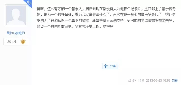 那年他发了一个帖子,质疑“为什么到现在都没有人为窦唯拍摄纪录片”、“王菲都上了音乐传奇吧。”