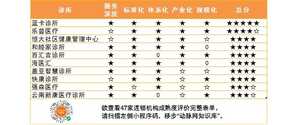 另外根据国内社区连锁诊所的实践经验, 提取5大模式作为成熟度指标, 对在运营的47家社区连锁诊所之建设主体进行初步归纳。通过服务深度、 标准化、 体系化、 产业化、规模化,按成熟度设置零星、 半颗星、 一颗星, 按总分进行商业模式成熟度评定。