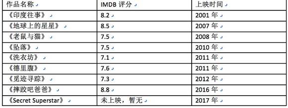 这家公司成立于2001年,目前已经出品了《地球上的星星》《孟买日记》等十部电影。15年10部的产量并不算高产,但每一部都是上乘之作。IMDB的评分都在7以上,有3部达到了8分,进入神片之列,最高的《摔跤吧爸爸》达到8.8分。要知道《霸王别姬》在这个评分体系里才8.1分,李安导演的《断背山》才7.7分,足见阿米尔·汗影业制作的分量。