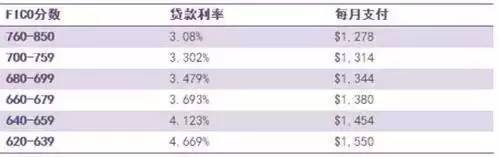 不同贷款人从600分到800分的信用分跨度,将会影响到贷款利率在4.669%-3.08%间变动。以30年30万美金的房屋贷款为例,并参考FICO分数与贷款利率的关系,那就两位意味着两位贷款人每月有272美元的支付差额。由此30年后,将会产生超过10万美金的差距!